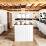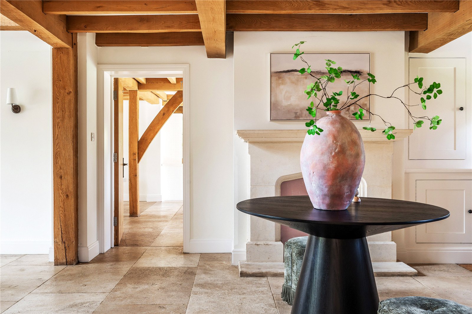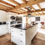 The reception hall itself is partly vaulted and particularly impressive, featuring limestone flooring and an open fireplace, setting a warm and elegant tone. To one side, the drawing and sitting rooms provide more formal yet equally inviting spaces, whilst the kitchen/family area forms the true hub of the home.