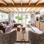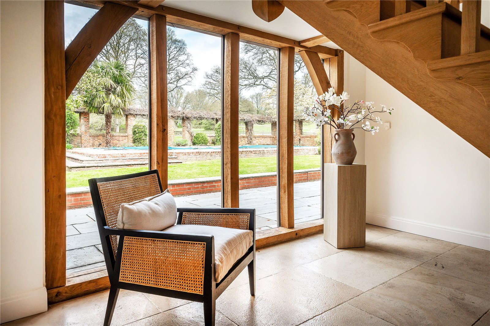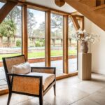 A striking double-height glazed entrance hall creates an immediate sense of arrival, flooding the interior with natural light and framing views through to the gardens beyond. The ground floor has been designed with families living and entertaining in mind, with underfloor heating throughout and a seamless flow between the principal reception spaces.