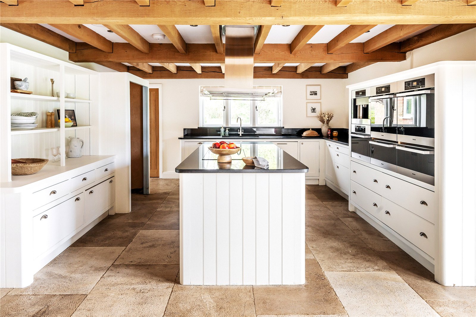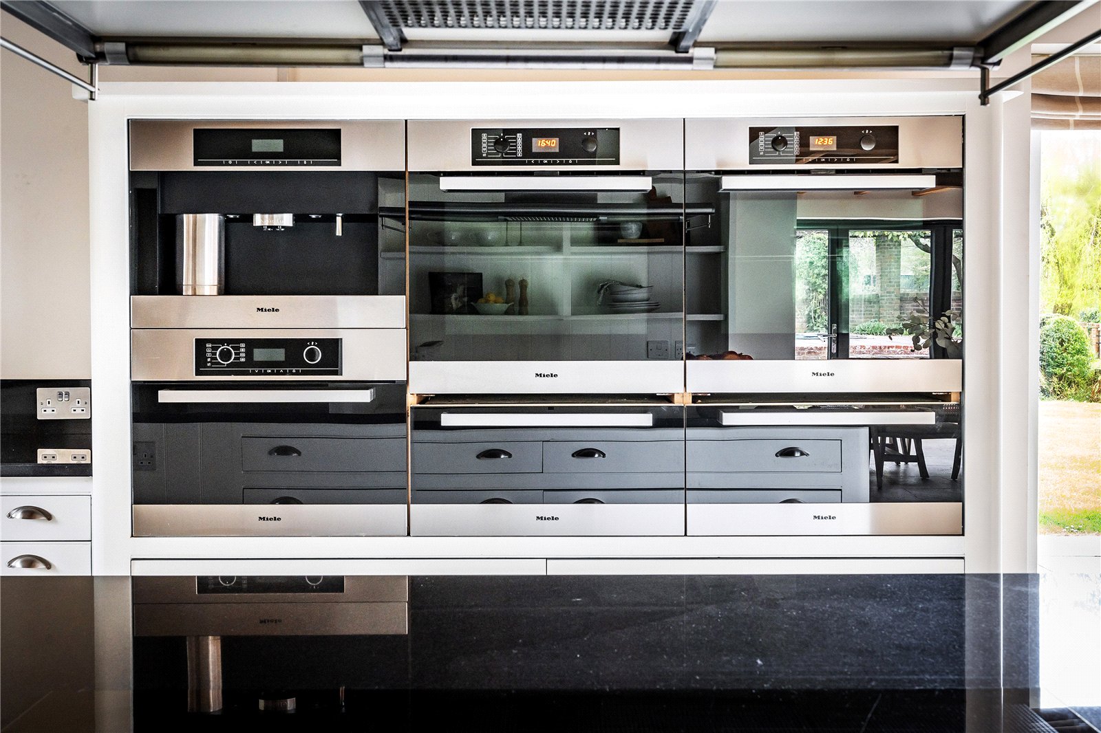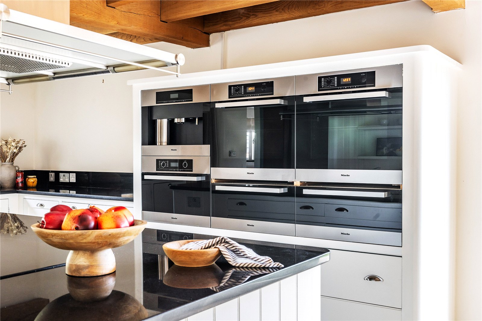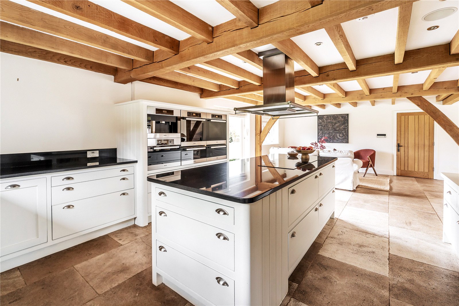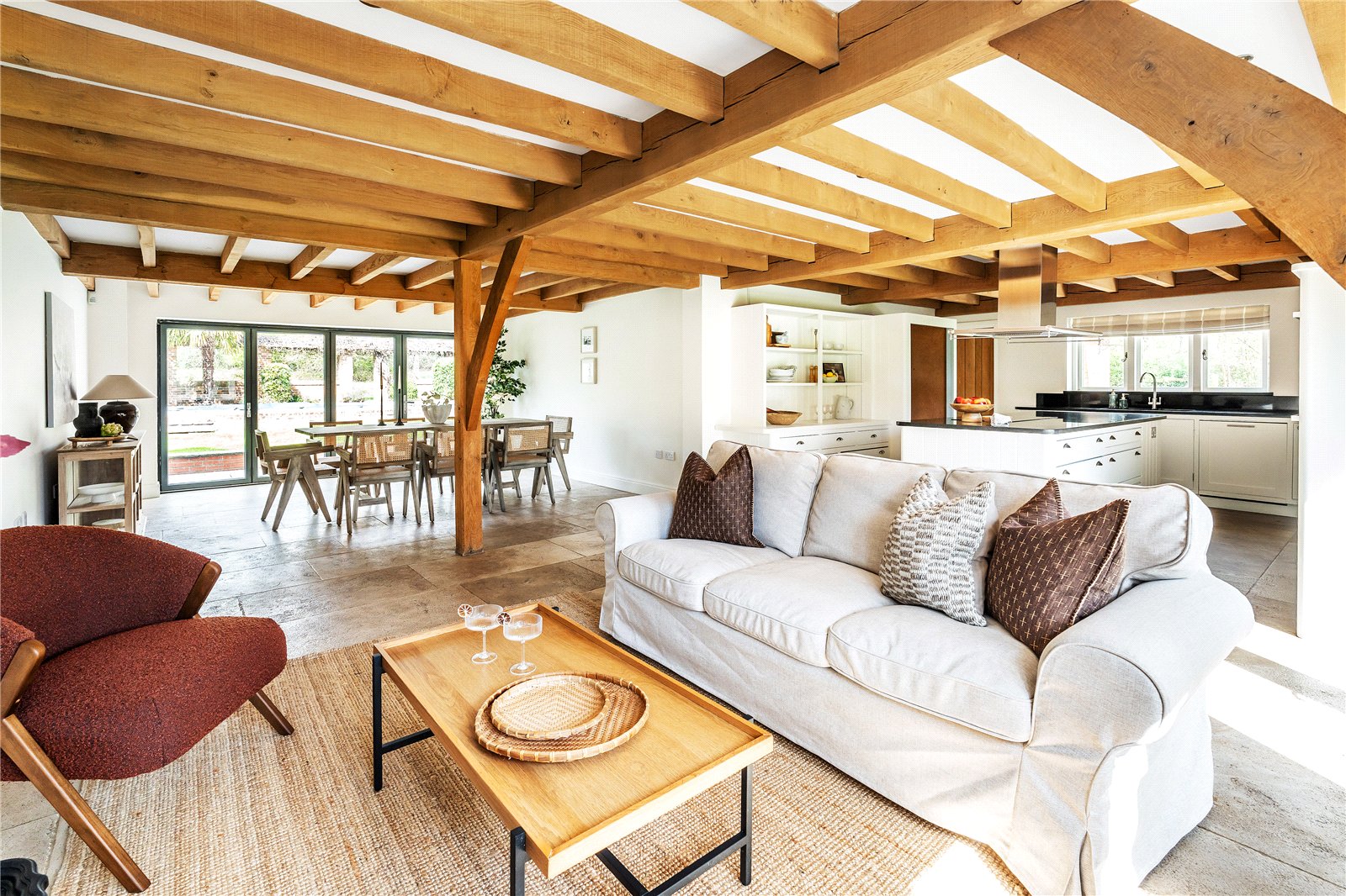 At the heart of the home lies an impressive open-plan kitchen/breakfast/family room, beautifully appointed with bespoke cabinetry, granite worktops and a comprehensive range of Miele appliances. Full-height glazing and bi-fold doors on either side draw the outside in, opening onto the terrace and swimming pool area, creating a superb space for year-round living and entertaining.