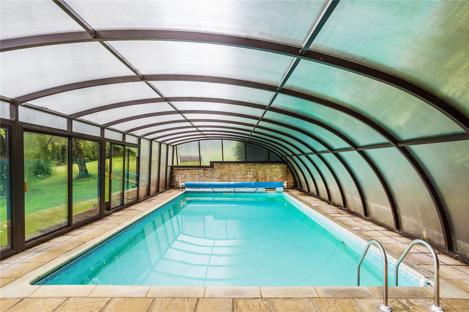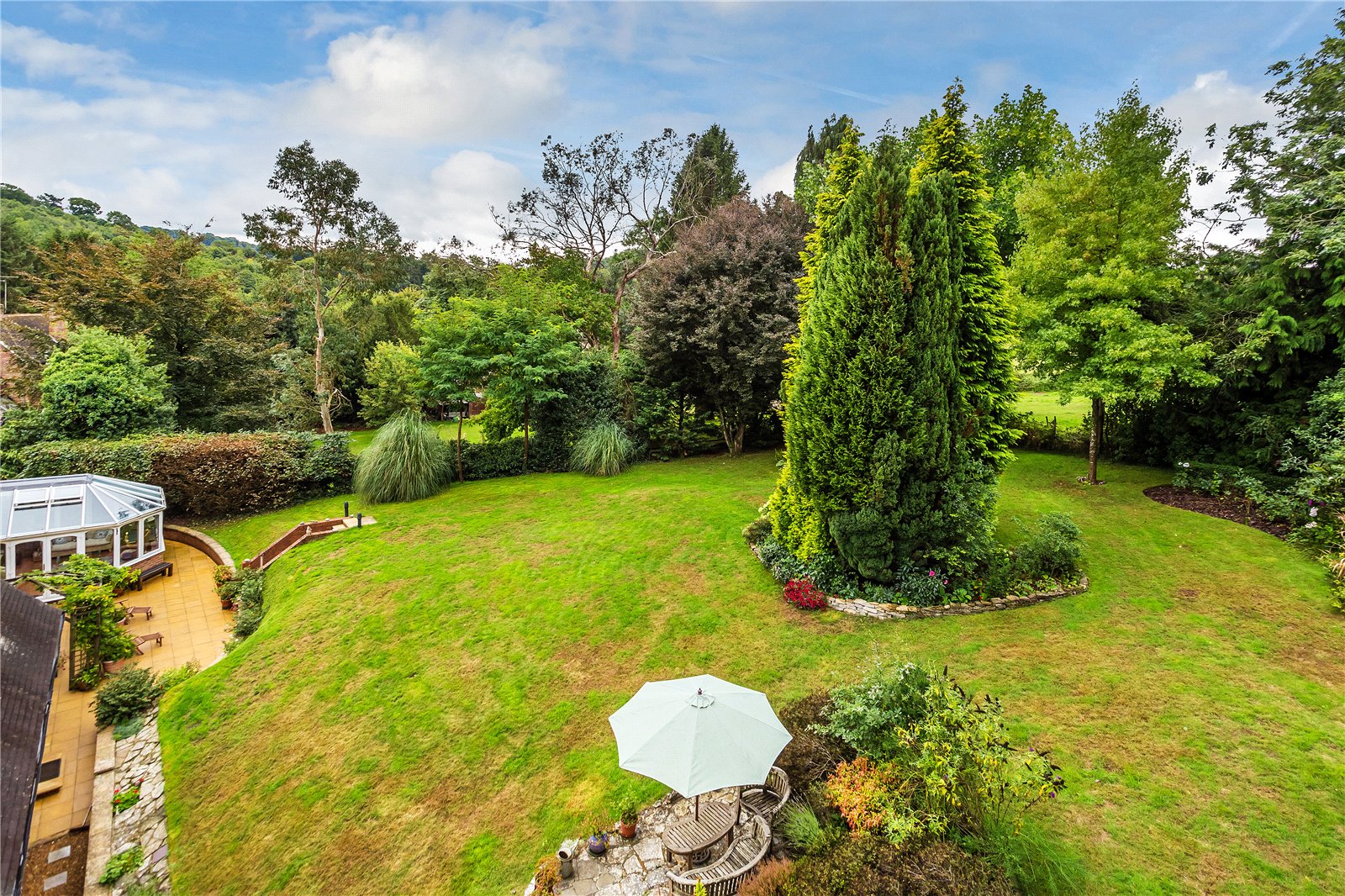 The gardens of Orchard Cottage are simply stunning. A large south-west facing terrace adjoins the house, with a few steps leading up to the fully enclosed garden. The lawn is edged with a variety of mature flower boarders, herbaceous planting, mature shrubs, and many specimen trees. The gardens continue up to the covered swimming pool. This clever domed building has several double width sliding doors to give the inside/outside feel to the pool. A timber built outbuilding offers changing facilities.