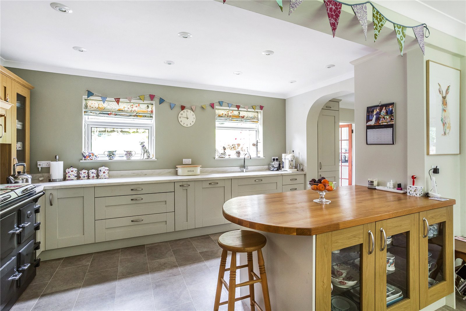 The study/music room is partially open plan to the main reception hallway. Further along the hallway you will find the cloakroom and kitchen/dining room. The kitchen is beautifully fitted with dual tone cabinetry in a shaker style, fitted range style cooker and fitted dishwasher. Ample eye and base level units provide a significant amount of storage. The kitchen area is separated from the dining area by a breakfast bar with glass display cabinets below.