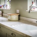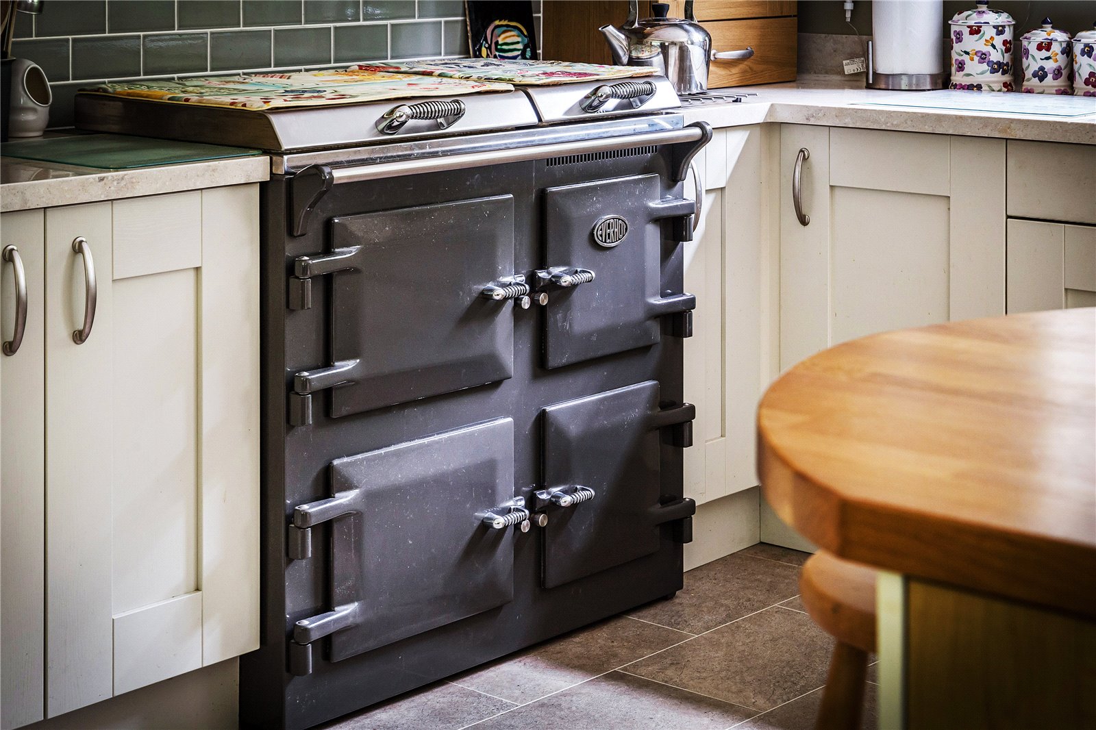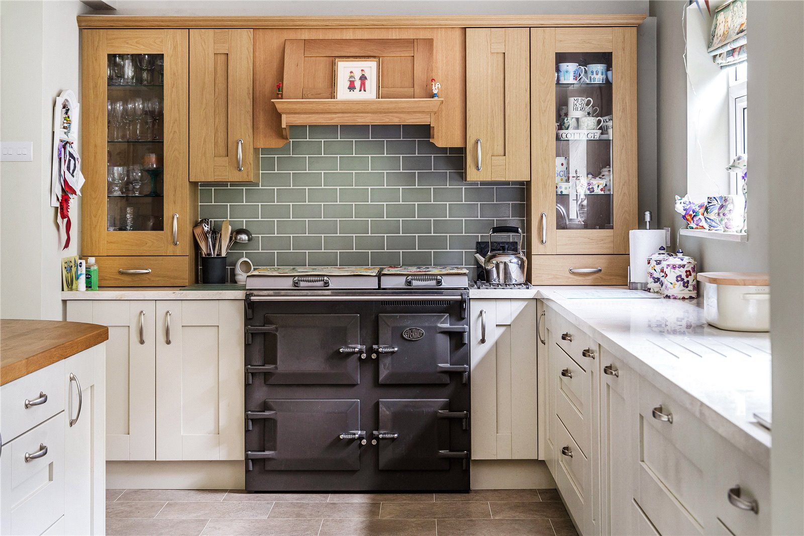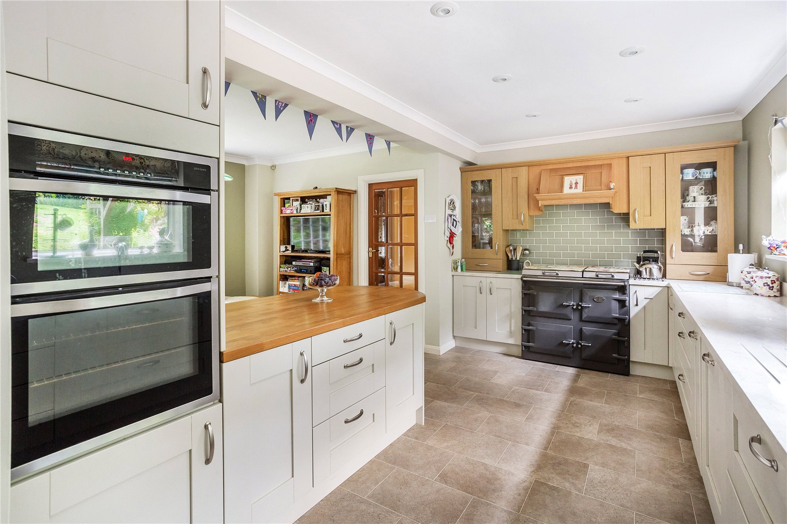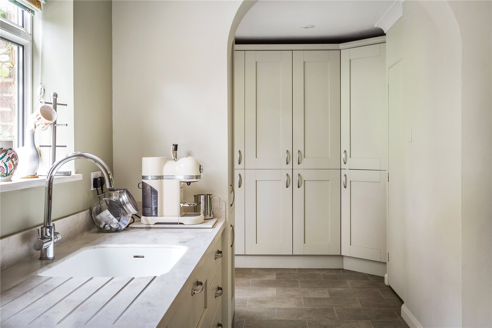 At one end of the kitchen are a wide range of floor to ceiling cabinets, larder and airing cupboard. The utility/boot room is also accessed from this area and has a doorway to the garden.