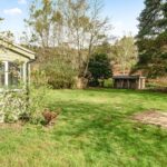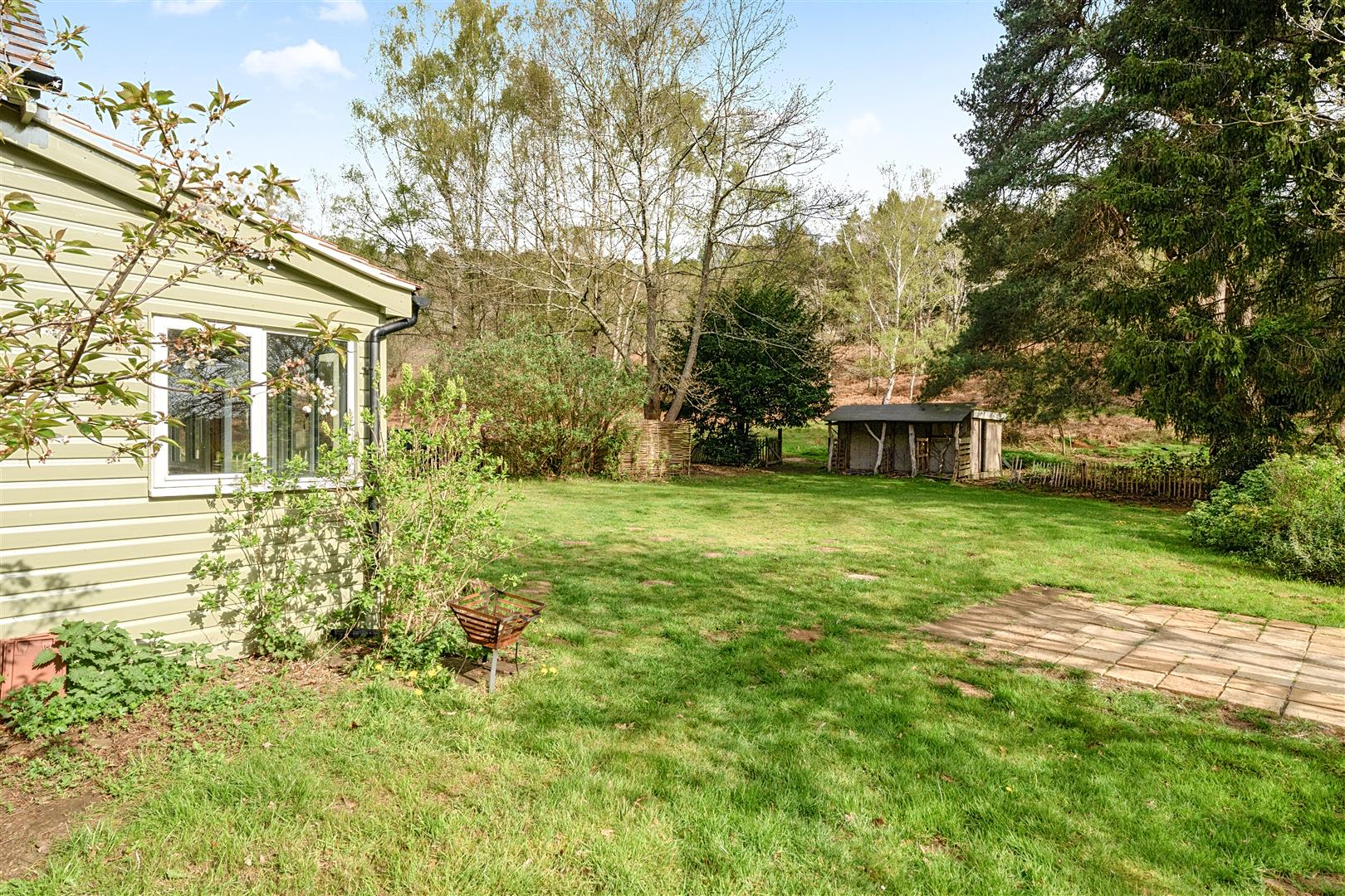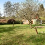 Mature trees and established planting frame the garden, creating a peaceful, private environment with a charming woodland backdrop. There is plenty of room for families, keen gardeners, or those seeking a tranquil outdoor retreat, while a useful outbuilding adds practical storage or potential for further use.