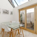 The kitchen has a modern and minimalistic look, giving it much appeal, with a range of high gloss units, Corian worksurfaces, a fitted range style cooker, wine fridge, tall ladder cupboard, fitted dishwasher and fridge freezer units. This excellent kitchen offers all the utilities a family might need. A clever glazed back extension with bi-fold doors and a vaulted ceiling provides a bright and airy dining area.