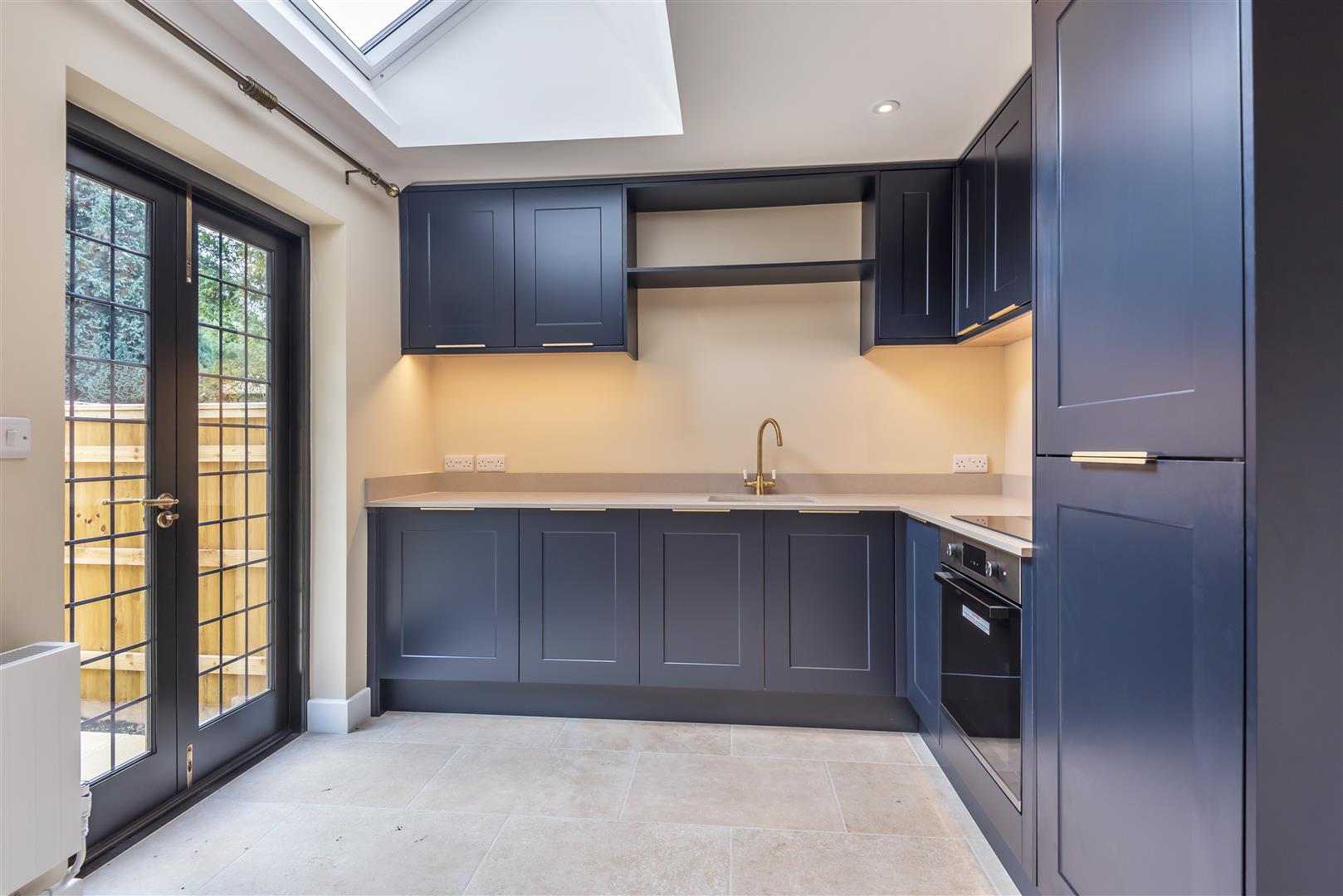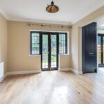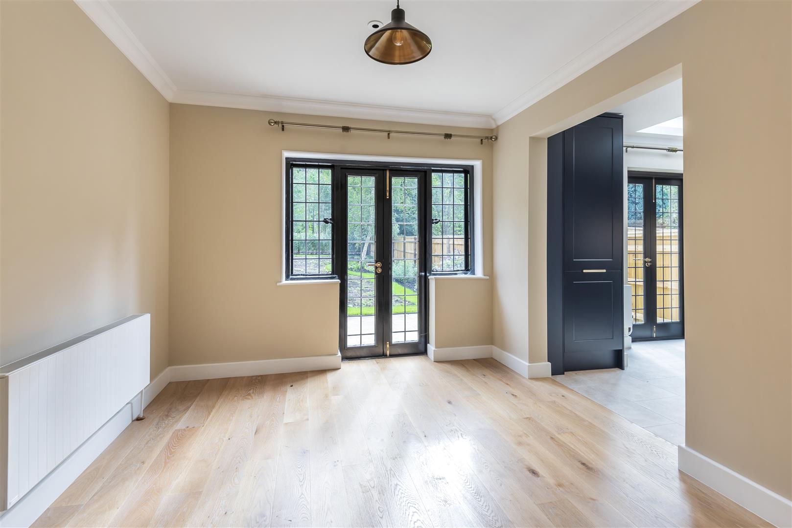 The ground floor is finished with hard flooring throughout. The front door opens into a porch and hallway, leading to a spacious bay-fronted living room, a dining room and fitted kitchen with integrated appliances and French doors to the garden. There is also a downstairs cloakroom/utility with washer and dryer.