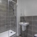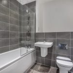 Both bathrooms are presented with white sanitaryware, chrome-finish brassware, and ceramic wall and floor tiles.