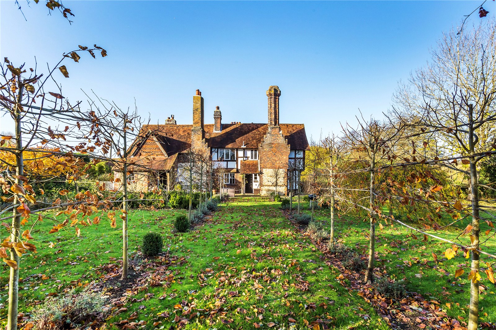 Unstead Manor is a fascinating and architecturally important Grade II* Listed period house believed to date from the 14th century with later additions. It is steeped in history and has welcomed many distinguished guests. Whilst predominantly timber framed the elevations are of brick and bargate stone under a clay tiled and Horsham stone roof. Internally the property benefits from a wealth of period features such as a magnificent vaulted drawing room with exposed crown post timbers, galleried landing and beautiful mullioned windows a feeling of the past is all around you.
