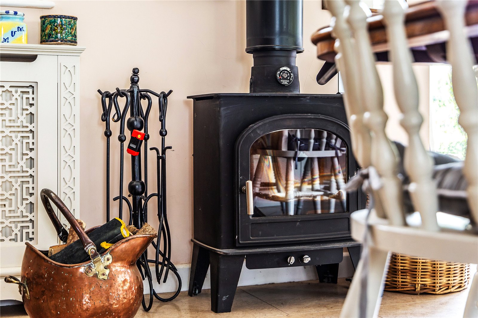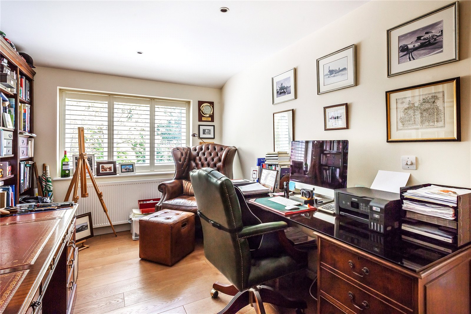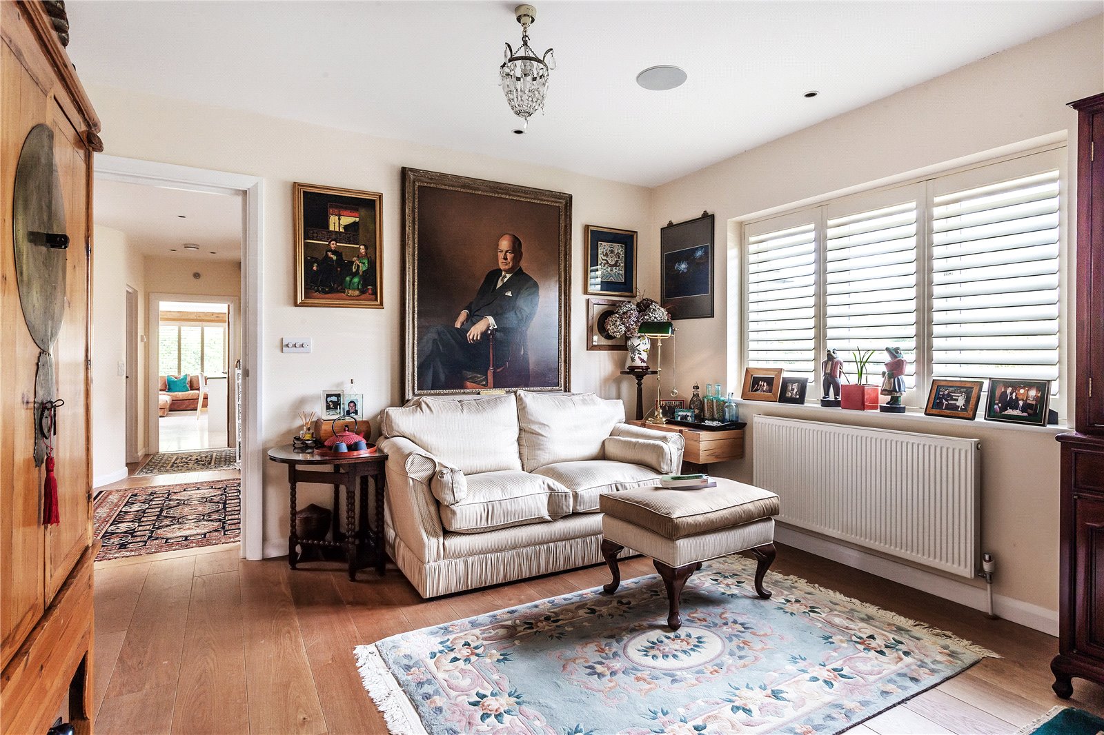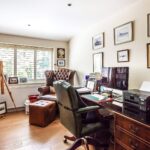 This stunning room with its oak framed extension plays host to a well-appointed bespoke kitchen, designed and installed by Searle & Taylor. A generous central island with cabinets below also offers space for a breakfast area. A wide range of cabinetry provides ample storage solutions with “leathered” granite work surfaces offering a contemporary and tactile feel. A modern fitted electric three oven Aga is complimented by a fitted Neff combi oven. Other features include a Liebherr Wine cooler, Miele dishwasher and space for an American style double fridge and freezer unit. The bright and airy space can be arranged to suit, but currently hosts a dining area and family seating areas. The westerly end of the kitchen has a bright and uplifting glazed wall, with a triple aspect overlooking the garden, paddock to the west and distant views to the north. All the windows have the benefit of plantation shutters. In addition, a separate utility/boot room with a single stable door to the garden plus a separate cloakroom completes this side of the home.
