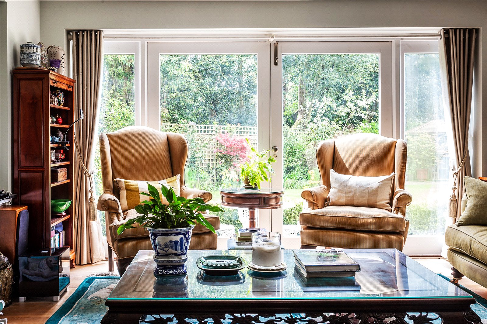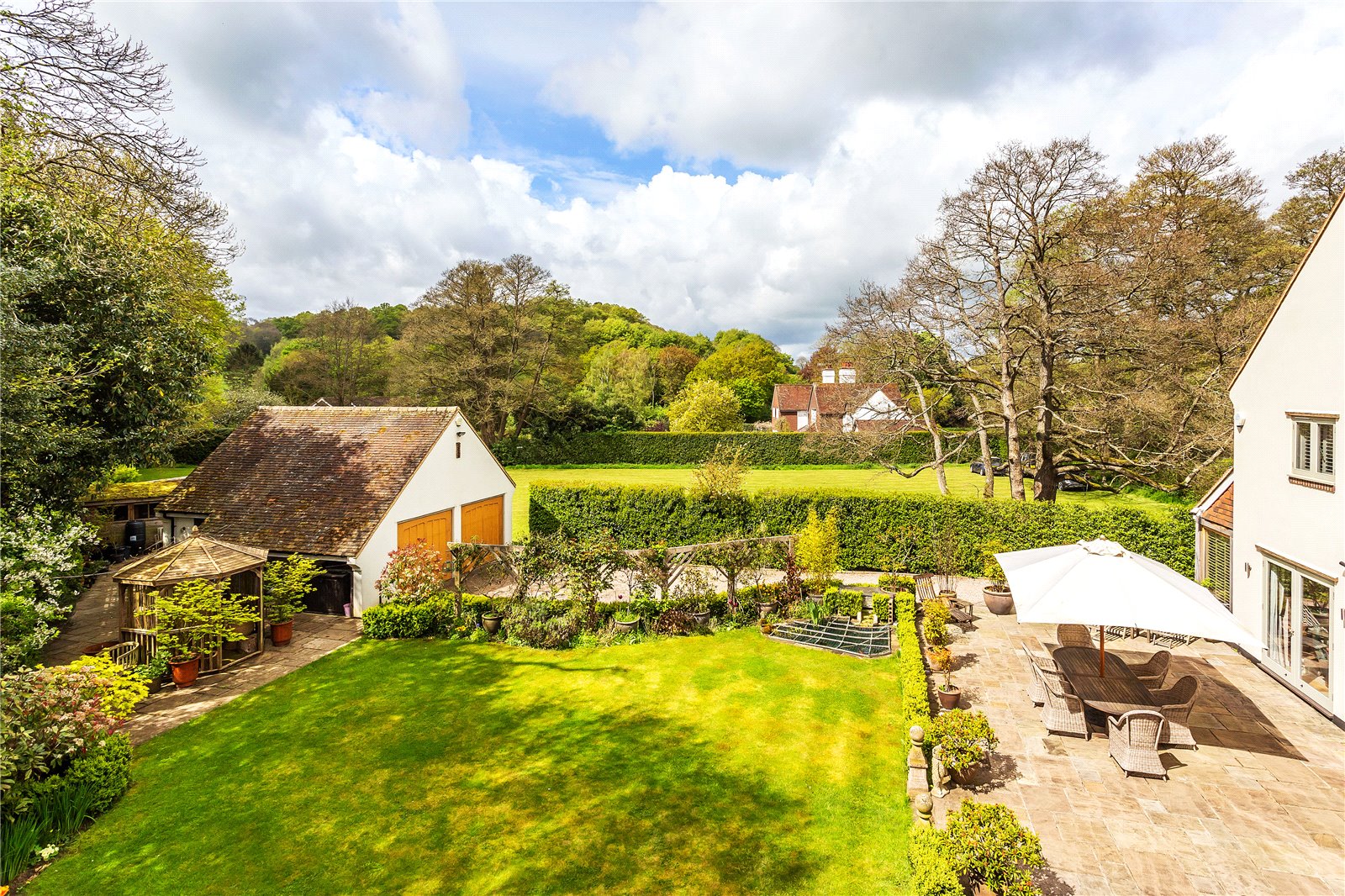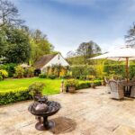 Leading from the principal reception rooms, access can be gained to the south facing rear garden. A delightful terrace extends along the full width of the building and overlooks a well-tended lawn. An array of flower bed borders are bursting full of perennial planting, mixed shrubs, and trees.